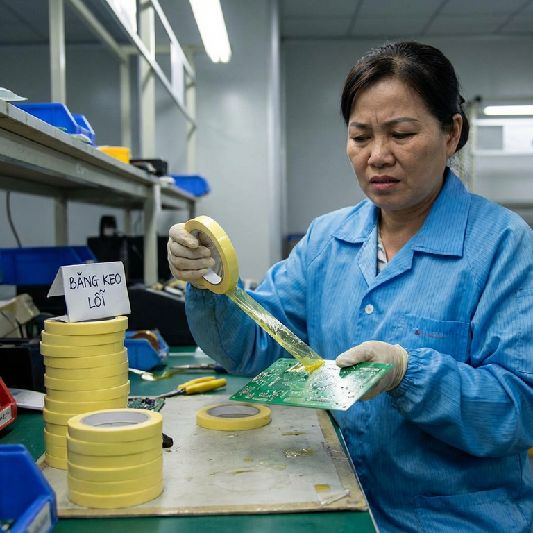 Vấn đề thứ hai là keo dán không đạt chuẩn. Sau khi bóc băng khỏi bo mạch hoặc linh kiện, để lại cặn keo màu vàng nhạt hoặc trong. Cặn này làm hỏng quy trình hàn sau đó, buộc phải rework bằng dung môi. Tính cả thời gian và nhân công, chi phí rework có khi gấp 5 lần giá cuộn băng.