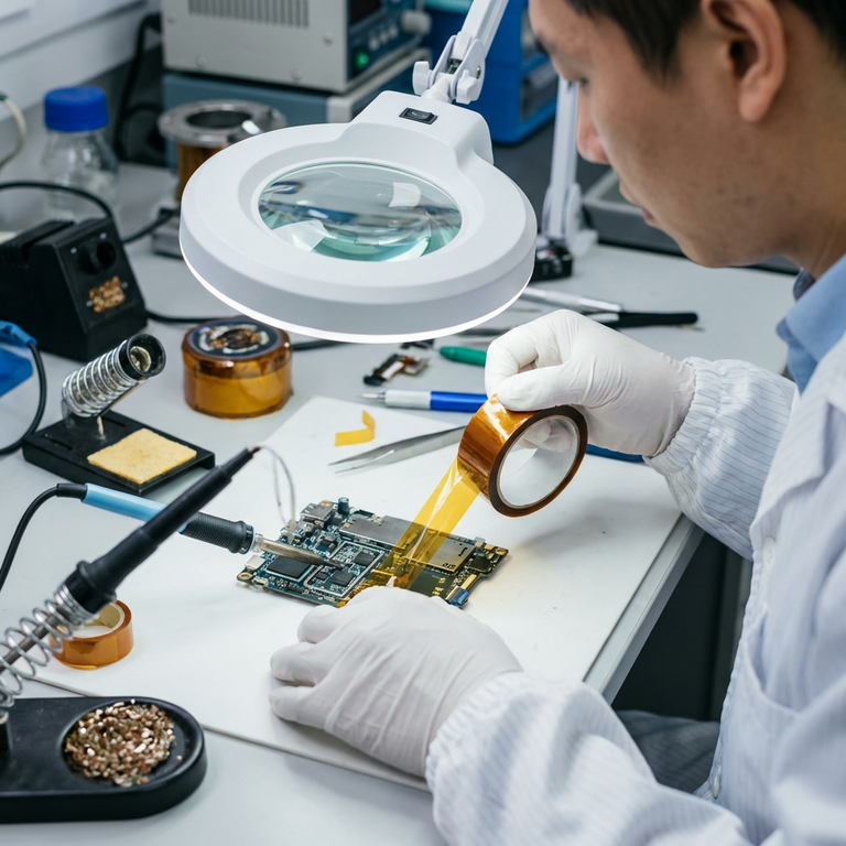 Khi rework linh kiện BGA hay QFN, kỹ thuật viên dùng băng kapton để cố định các chip lân cận trước khi đưa máy khò vào. Nhiệt độ khò có thể chạm 350°C ở vùng cục bộ, và đây là nhiệt mà băng giấy hay băng PET sẽ cháy thành than. Băng polyimide vẫn giữ nguyên hình dạng và độ dính.