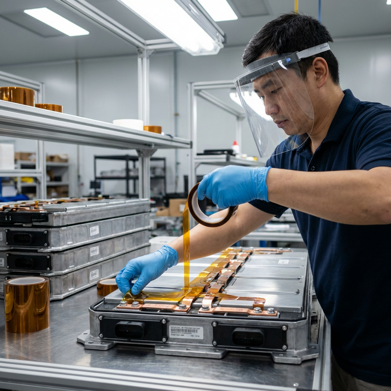 Mảng pin xe điện là phân khúc tăng trưởng nhanh nhất cho mặt hàng này tại Việt Nam trong ba năm gần đây. Băng dính polyimide được dùng để cách điện giữa các cell lithium trong battery pack, ngăn dòng rò khi cell phồng nhẹ do chu kỳ sạc xả. Một module 96 cell có thể dùng tới 40-50 mét băng cho mỗi đơn vị, nên độ ổn định lô hàng là vấn đề lớn.