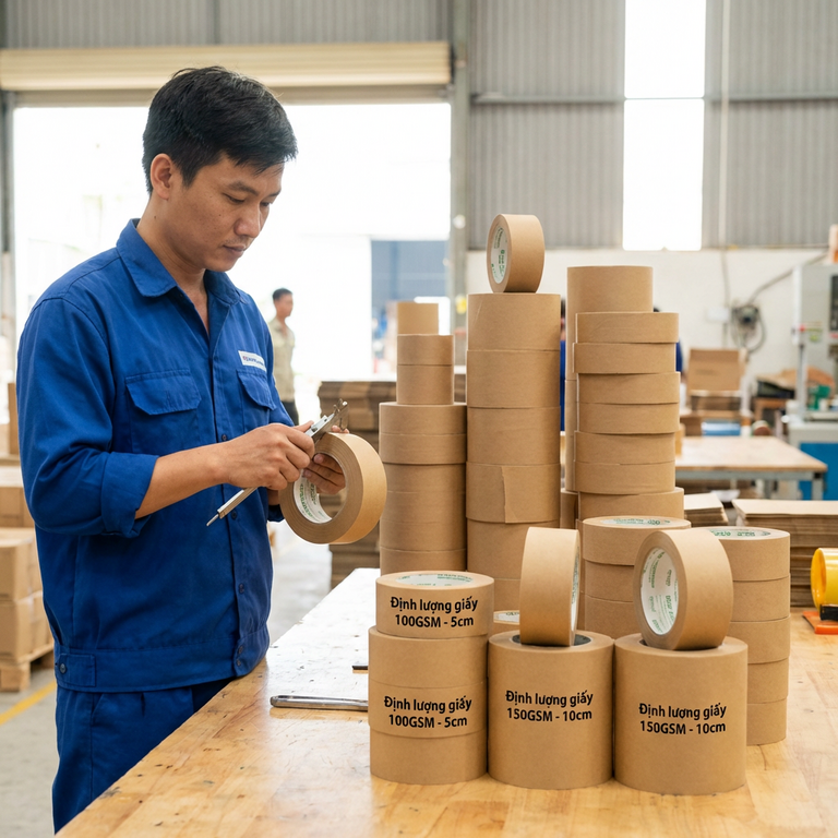 Khi đặt hàng nhà cung cấp, đừng chỉ nói “cho tôi 100 cuộn băng keo giấy da bò”. Hãy hỏi rõ ba thông số: định lượng giấy (gsm), loại keo (gốc nước hay cao su), và có sợi gia cường hay không.