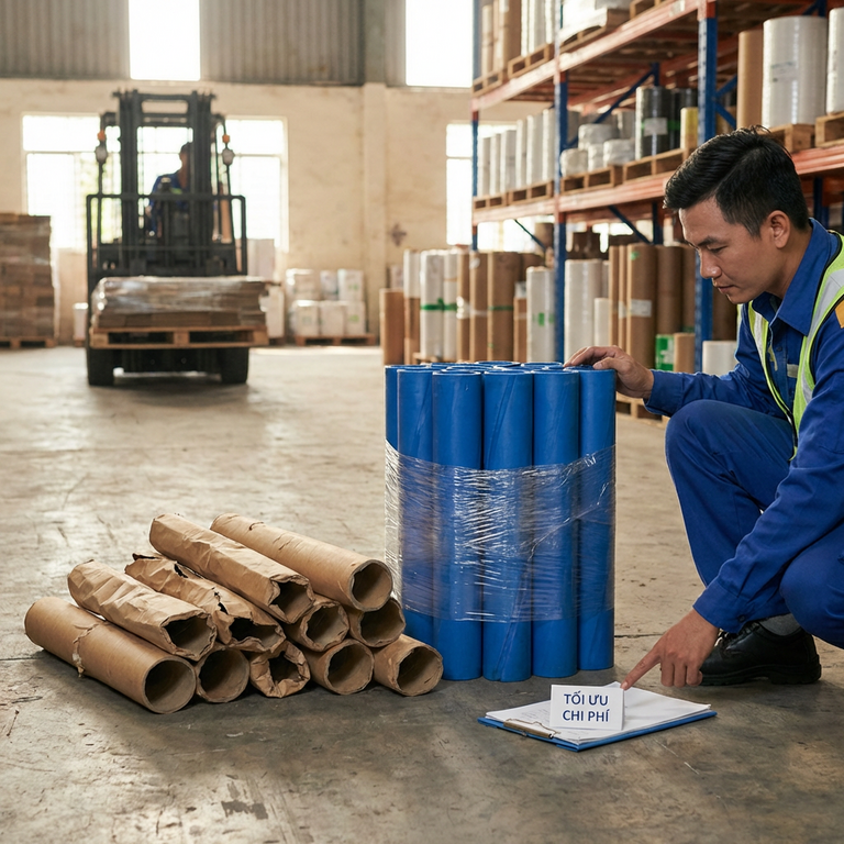 Khi cộng chi phí logistics, bài toán đảo chiều. Lõi nhựa cứng giảm tỷ lệ móp cuộn trong bốc xếp container từ khoảng 4 đến 6 phần trăm xuống dưới 1 phần trăm. Một container 20 feet chở khoảng 18 đến 20 nghìn cuộn, tỷ lệ hỏng giảm 4 phần trăm là giữ lại được 700 đến 800 cuộn nguyên giá.