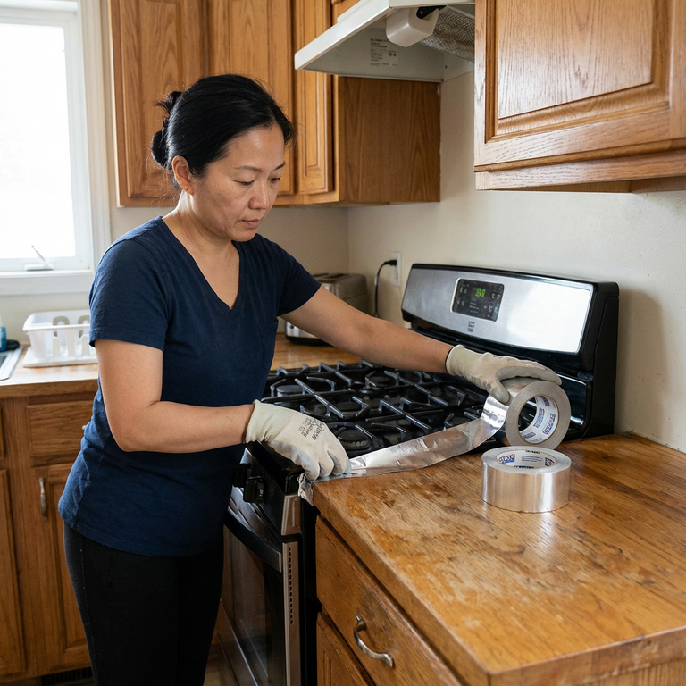 Khoảng cách an toàn với nguồn nhiệt trực tiếp tối thiểu là 10cm với bếp gas, 5cm với bếp từ. Băng dính nhôm chịu được 150 độ C nhưng không chịu được lửa trực tiếp. Dán quá sát đầu đốt bếp gas, nhiệt độ cục bộ có thể vượt 300 độ C và keo sẽ chảy thành vệt đen rất khó tẩy.