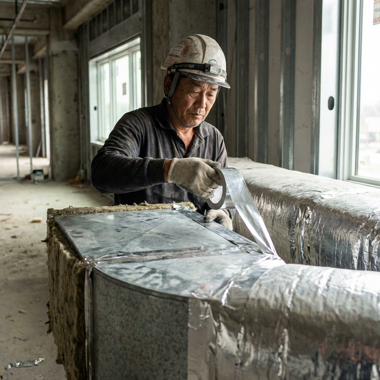 Trong các dự án HVAC, băng keo dán nhôm phụ trách bốn nhiệm vụ chính. Bịt mối nối ống gió tôn kẽm, dán mép bông thủy tinh và cao su non bọc cách nhiệt, gia cố túi khí cách nhiệt mái tôn, và bít các điểm hở của lớp foil cách nhiệt sàn.