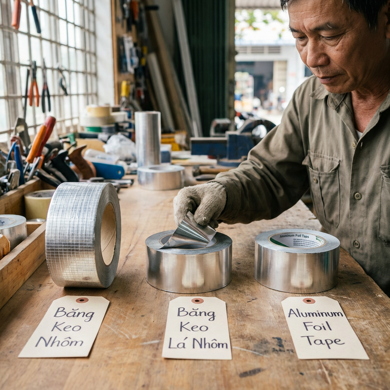 Hàng nhập khẩu đóng nhãn “aluminum foil tape” thường có chất lượng đồng đều hơn vì phải qua kiểm định trước khi xuất xưởng. Hàng không nhãn trôi nổi ngoài chợ có thể tốt, có thể tệ, nhưng không có cách nào kiểm chứng trừ khi cắt mẫu đem đi đo. Trong thi công công trình, không ai có thời gian làm việc đó.