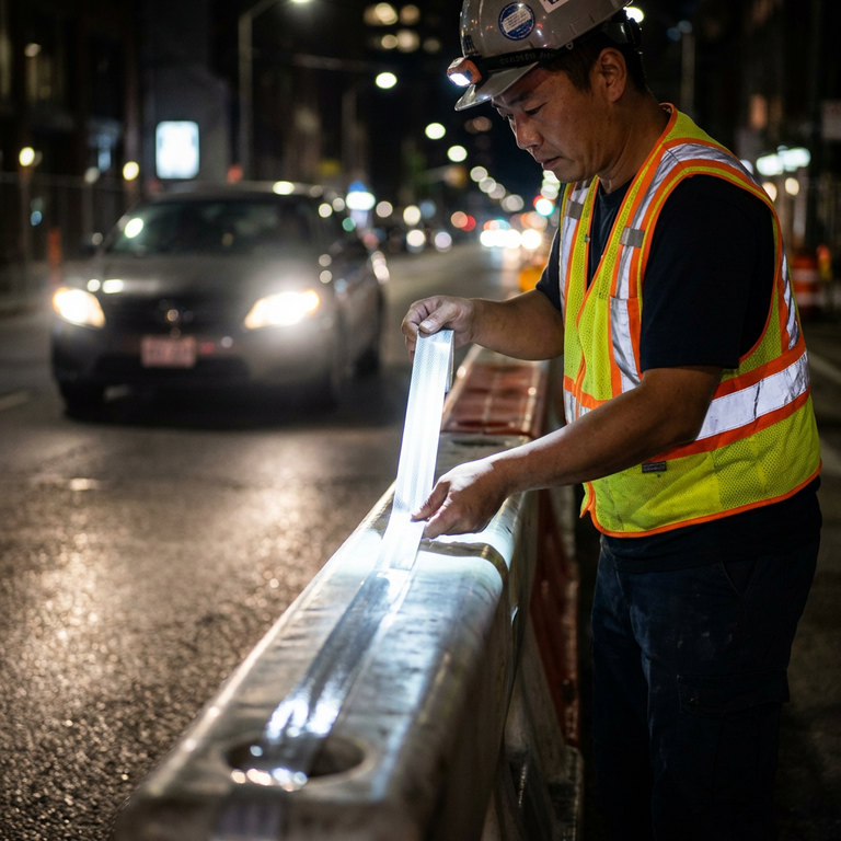 Trong thi công hạ tầng, băng keo decal phản quang được dán lên cọc tiêu, hộ lan tôn sóng, biển báo công trường tạm, và thiết bị thi công ban đêm như xe lu, xe ủi. Quy ước màu sắc rất quan trọng và không nên tự ý thay đổi:
