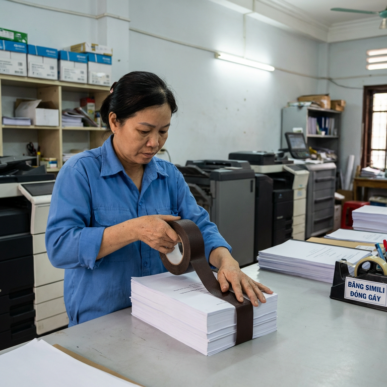 Trong nghề đóng sách, có một nghịch lý ít ai nói thẳng. Cùng một cuốn luận văn 300 trang, gáy đóng bằng băng keo simili loại tốt có thể trụ được 5-7 năm, còn loại trôi nổi thì bong tróc chỉ sau một mùa hè ẩm. Khoản chênh lệch chi phí giữa hai loại này không quá 30 nghìn đồng cho mỗi cuộn, nhưng chi phí làm lại sách cho khách thì gấp hàng chục lần. Bài viết này gom lại những gì 10 năm làm việc với vật tư đóng sách đã dạy tôi về cách chọn, dùng và bảo quản loại băng dán đặc thù này.