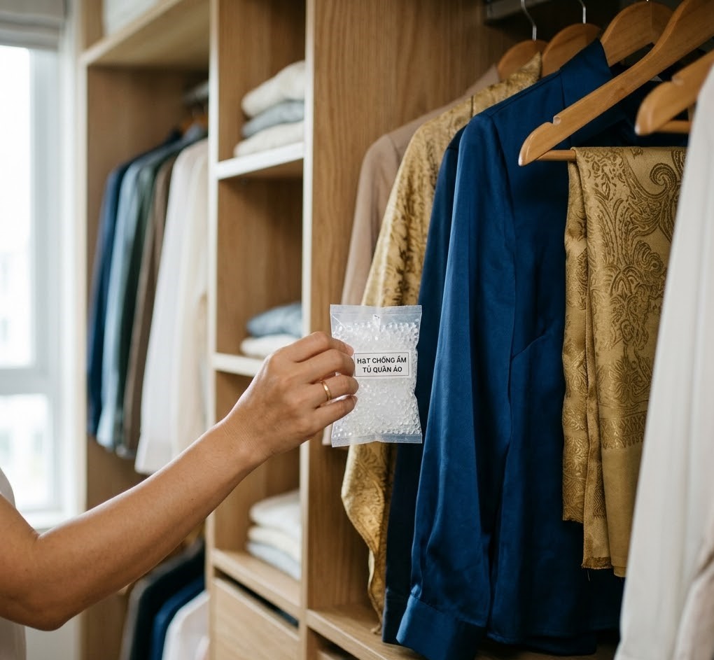 Giải pháp thực tế: cho gói hạt chống ẩm vào một túi vải cotton nhỏ, hoặc treo trong hộp carton nhỏ có đục lỗ. Khoảng cách tối thiểu 5cm giữa gói hạt và bề mặt vải cao cấp.