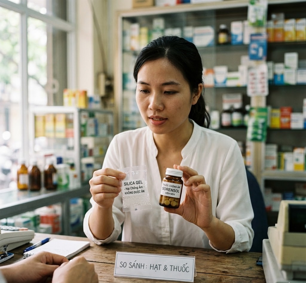 Thuốc chống ẩm lại hoạt động theo cơ chế khác hoàn toàn. Dạng viên nén hoặc dạng bột thường chứa canxi clorua, hút ẩm đến mức chảy nước và phải đổ bỏ sau khi dùng. Hai sản phẩm này không thay thế được nhau, dù nhiều cửa hàng vẫn gộp chung trên kệ.