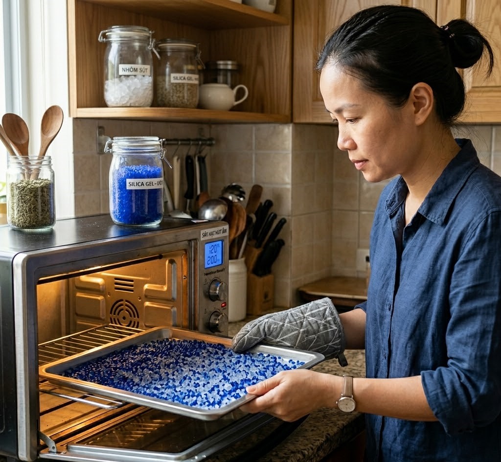 Sấy silica gel bằng lò nướng: trải mỏng trên khay, đặt 120°C trong 90-120 phút, kiểm tra mỗi 30 phút. Lò vi sóng công suất 700-800W: sấy ngắt quãng 2 phút mỗi lần, tổng 6-8 phút, để nguội giữa các lần. Chảo khô là cách thủ công nhất: lửa nhỏ, đảo liên tục, đến khi gói thử nghiệm chuyển về màu xanh/cam ban đầu là được.