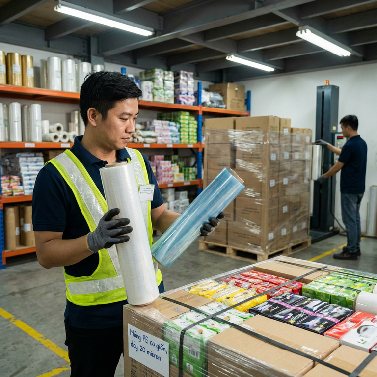 Với đóng gói thương mại điện tử và bọc hàng hóa lẻ, màng PE tự dính cỡ nhỏ là lựa chọn tối ưu. Nó giúp bó nhiều món cùng đơn thành một kiện gọn, tránh thất lạc khi chuyển kho. Xưởng của mình có khách là shop giày dép online, mỗi ngày họ dùng 15-20 cuộn mini chỉ để bó các đôi giày theo size.